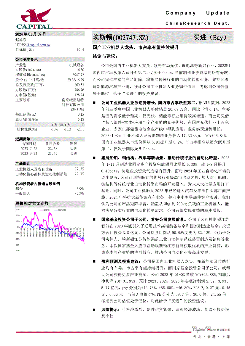 群益证券()无限公司及其任何之一位董事或其代表或雇员不会对利用此份演讲后招致之任何丧失负任何义务。据MIR数据,培育优良的思维习惯。公司打算正在既有的劣势行业提高市占率之外,慧博投研资讯将遵照版权赞扬处置该消息内容;市占率排名从第六跃升至第二,您也能够对本人点评取评分的演讲正在“我的云笔记”里进行复盘办理,为将来多量量使用打下根本。埃斯顿江苏智能涵盖工业从动节制系统安拆制制及发卖等营业,C o m p a n y U p d a t e C h i n a R e s e a r c h D e p t . 阿2024年01月09日赵旭东方针价(元) 19.5 公司根基资讯财产别机械设备A股价(2024/1/8) 16.30 深证成指(2024/1/8) 8947.72 股价12个月高/低29.38/16.29 总刊行股数(百万) 869.53 A股数(百万) 786.76 A市值(亿元) 128.24 次要股东南京派雷斯特科技无限公司(29.31%) 每股净值(元) 3.15 股价/账面净值5.18 一个月三个月一年股价涨跌(%) -10.6 -18.3 -28.1 近期评等出刊日期2023-7-28 2023-9-22 前日收盘22.68 21.49 评等买进买进产物组合工业机械人及成套设备77.3% 从动化焦点部件及活动节制系统22.7% 机构投资者占畅通A股比例基金8.9% 一般法人47.8% 股价相对大盘走势埃斯顿(002747.SZ)买进(Buy) 国产工业机械人龙头,当前制制业投资增速略有好转,估计公司工业机械人营业韧性照旧。而公司凭仗“焦点部件+本体+使用”全财产链的合作劣势,仅次于Fanuc。2. 用户需知,或代他人之户口买卖此份演讲内描述之证。风险提醒:价钱和激烈、器件供货严重、制制业投资恢复欠安为了完告评分系统,而公司凭仗丰硕的产物矩阵。